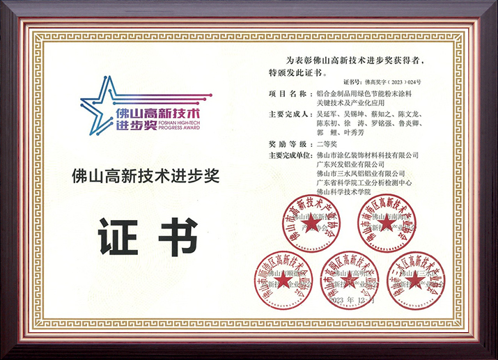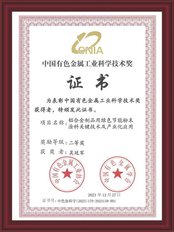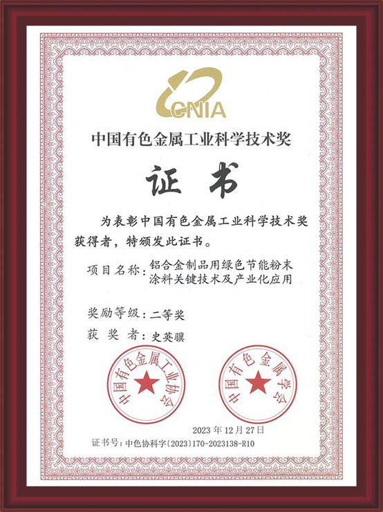 • 中國有色金屬工業(yè)科學技術(shù)獎《鋁合金制品用綠色節(jié)能粉末涂料關(guān)鍵技術(shù)及產(chǎn)業(yè)化應用》