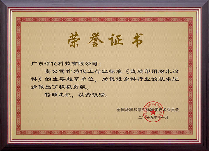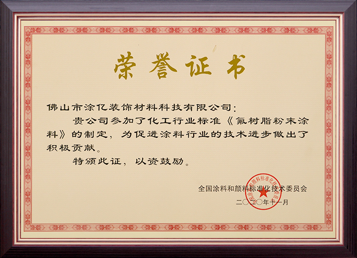 • 《氟樹脂粉末涂料》化工行業(yè)標(biāo)準(zhǔn)制定貢獻(xiàn)獎(jiǎng)